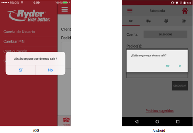 Si el usuario desea cancelar la acción de salir deberá presionar el botón [No] y esta acción mostrará la pantalla de inicio determinada o si el usuario sigue a un pedido, se mostrará la pantalla "Seguidos".