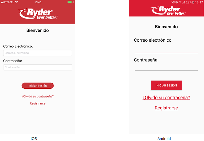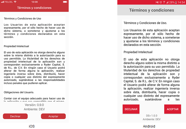 Al presionar sobre el icono, se mostrará una pantalla con el logo de Ryder y a continuación la pantalla de "Términos y Condiciones", donde se podrán aceptar, presionando el botón de "Aceptar".