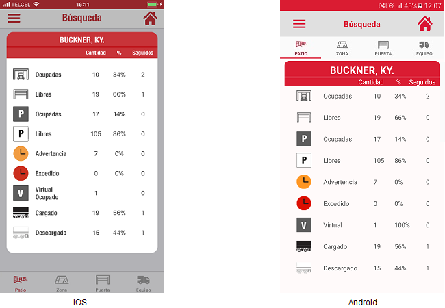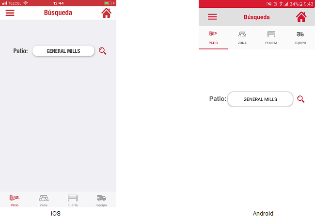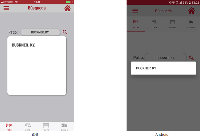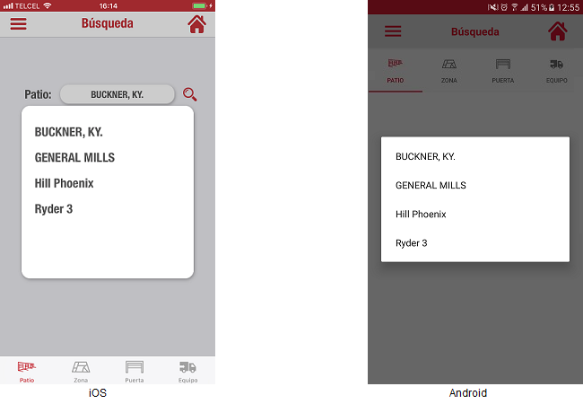 Si el usuario desea seleccionar otro patio, debe presionar el campo donde se visualiza el nombre del patio por default, así la aplicación mostrará una lista de patios asociados al usuario.
