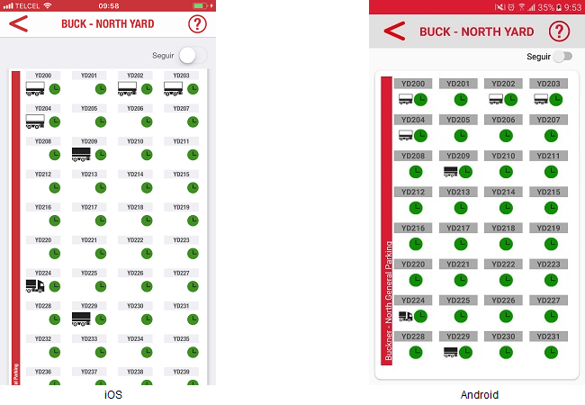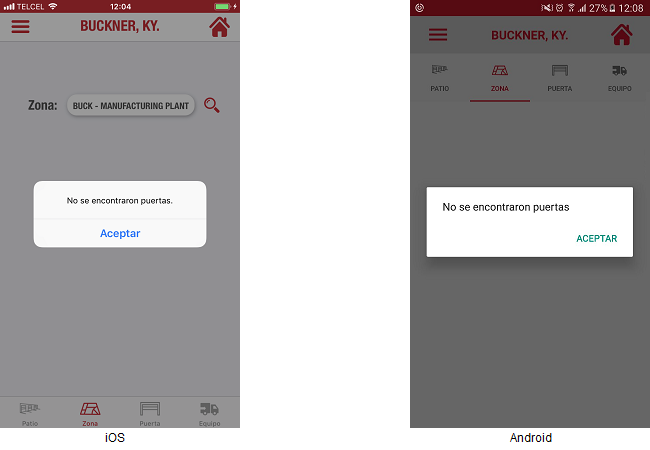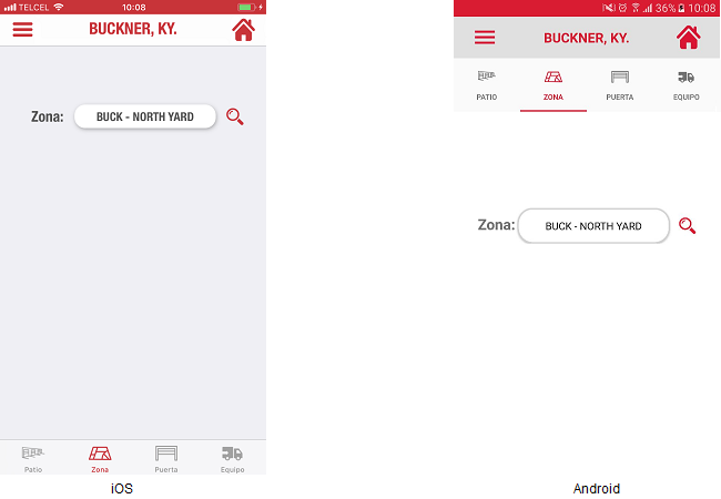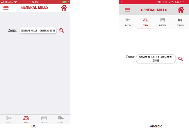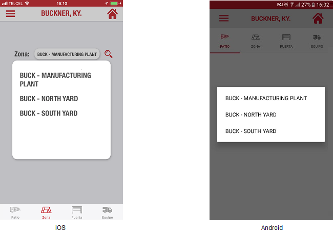 Si la primer zona de la lista no es la de interés, el usuario debe presionar sobre el campo para seleccionar otra zona, mostrándose la lista de zonas asociadas al patio que tiene el usuario o al patio que previamente se haya seleccionado.