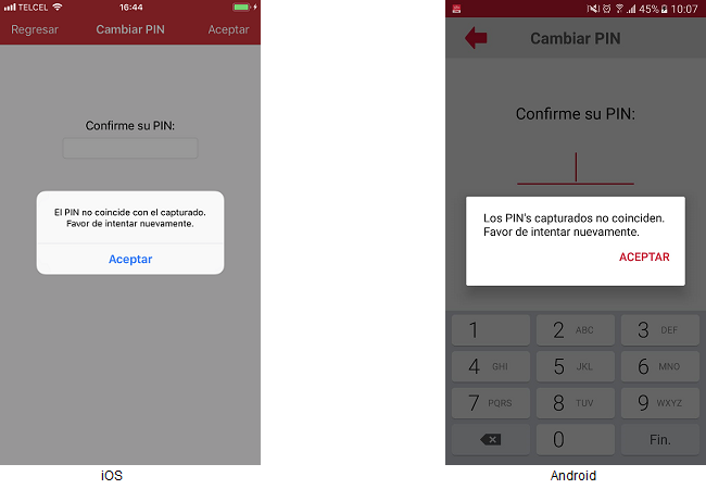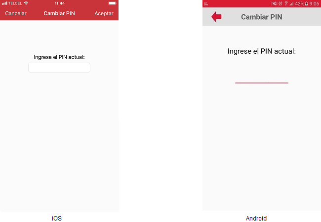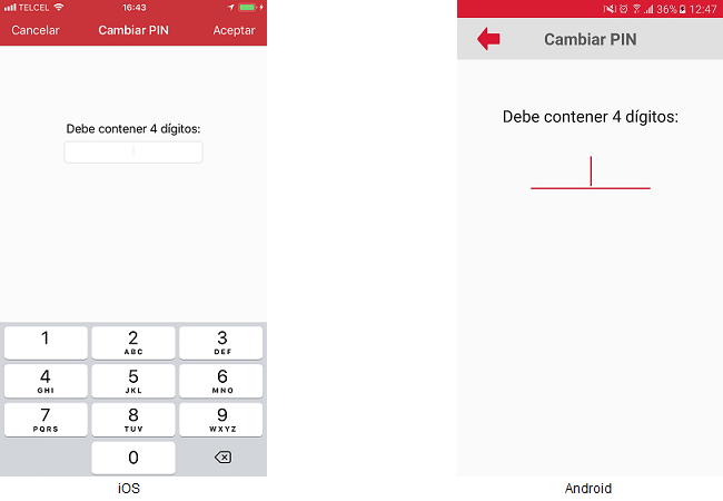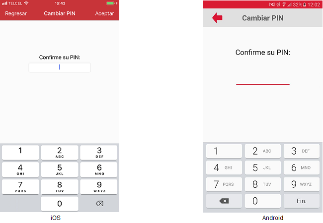 Se captura el PIN actual y se presiona sobre el icono del teclado para confirmar la captura (Android) o sobre el botón "Aceptar" en iOS.