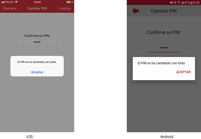 Al capturar correctamente el PIN junto con la confirmación, el usuario presiona el botón "Aceptar" en iOS y sobre el icono del teclado en Android, se visualizará un mensaje "El PIN se ha cambiado con éxito".