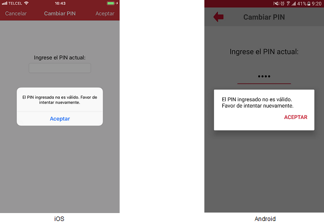 Si el PIN actual no corresponde, se mostrará un mensaje "El mensaje ingresado no es válido. Favor de intentar nuevamente"