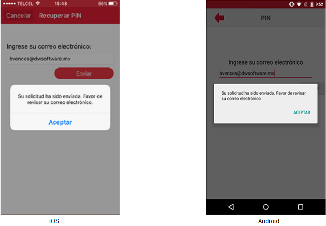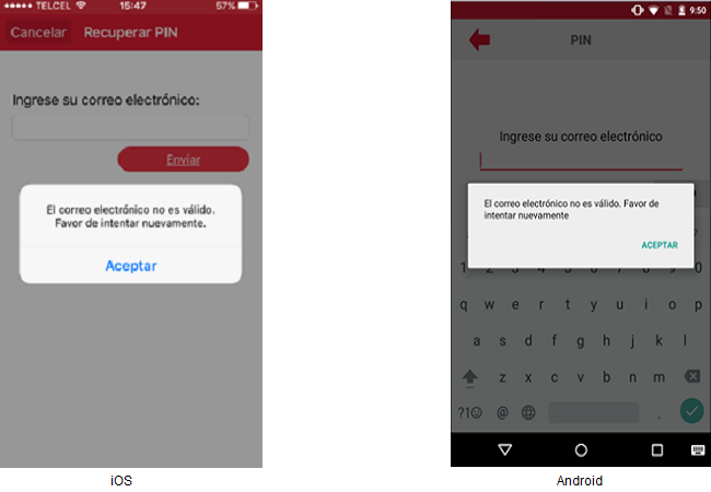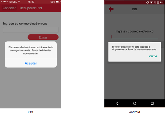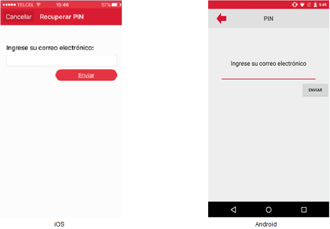 El usuario deberá presionar la opción “¿Olvidó su PIN?” y se mostrará la pantalla donde se hace solicitud del correo electrónico.