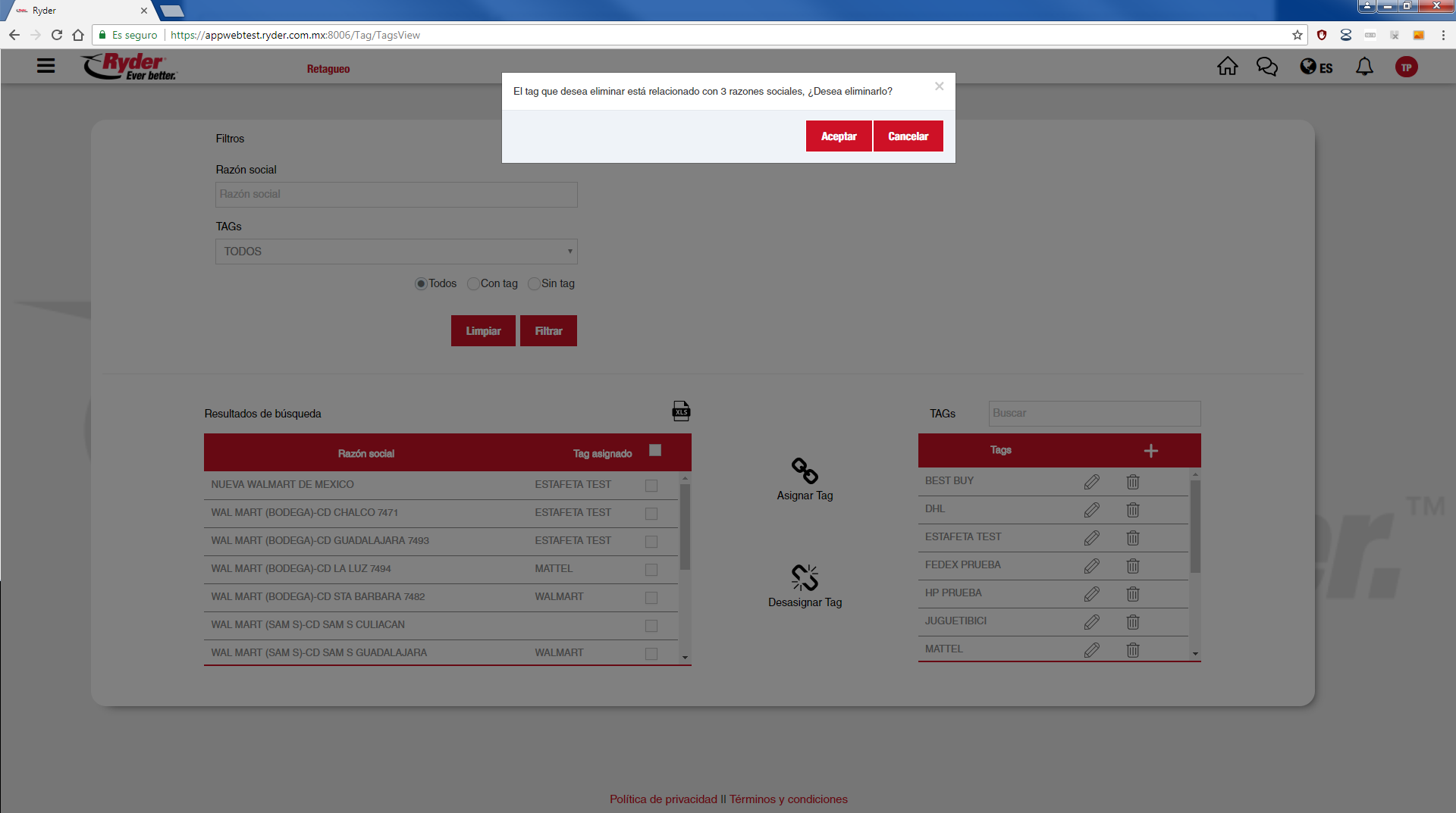 Al dar clic sobre el icono "bote", el sistema mostrará un mensaje de confirmación, con la cantidad de razones sociales que están relacionadas con ese tag.