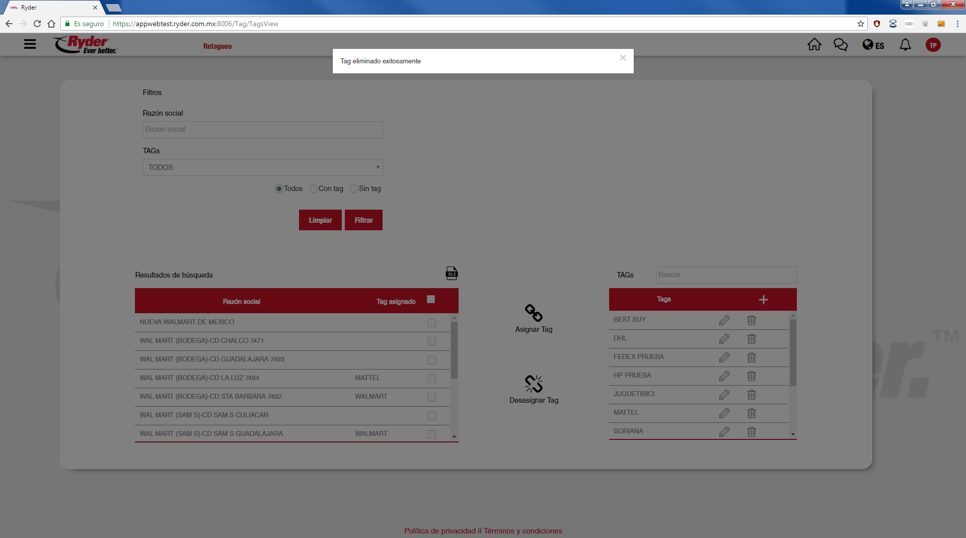 Si el usuario presiona el botón [Aceptar], el sistema eliminará automáticamente las relaciones que tiene ese tag con razones sociales, mostrándose un mensaje "Tag eliminado exitosamente".