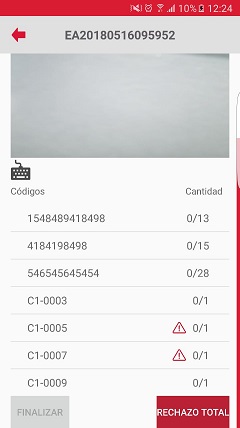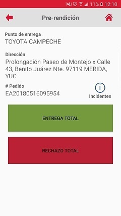 Se podrá presionar sobre el botón "Continuar y se deberá mostrar la pantalla "Pre-rendición" que contendrá los datos del pedido, el icono para registrar incidentes, el botón "Entrega Total" y el botón "Rechazo Total".