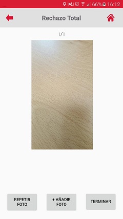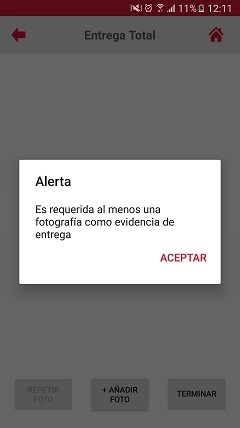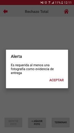 La aplicación validará que se haya tomado al menos una fotografía y si no se cumple dicha validación, se mostrará un mensaje "Es requerida al menos una fotografía como evidencia del rechazo". El usuario deberá aceptar el mensaje y la aplicación permanecerá en espera de captura de fotografía.