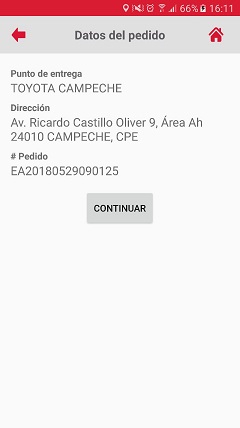 El usuario podrá seleccionar el pedido para la entrega, mostrándose los datos del pedido en la pantalla "Datos del pedido" y un botón [Continuar] que podrá ser presionado por el usuario.