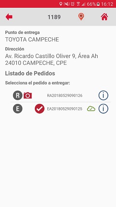 Al haber guardado correctamente las evidencias de rechazo, se mostrará la pantalla "Pedidos" que contienen los puntos de entrega, números de pedido y en el pedido entregado, se mostrará un check mark rojo que identifica el rechazo total, además del icono para visualizar la razón del rechazo o asignar algún incidente.