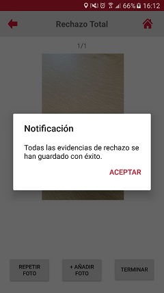 Si la validación se cumple, se mostrará el mensaje "Todas las evidencias de rechazo se han guardado con éxito. y el usuario podrá aceptar el mensaje.