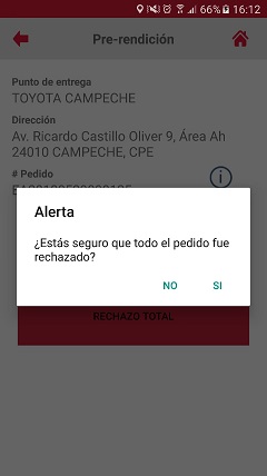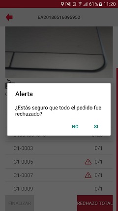 Se podrá presionar sobre el botón [Rechazo Total], mostrándose el mensaje "¿Estás seguro que todo el pedido fue rechazado?".