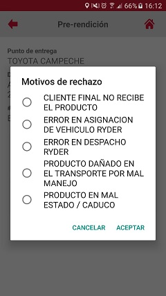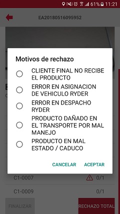 Si el usuario presiona la opción [Si], se mostrará una lista de opciones donde el usuario podrá elegir una de ellas para indicar la razón de rechazo del pedido y al finalizar el usuario deberá presionar el botón [Confirmar].