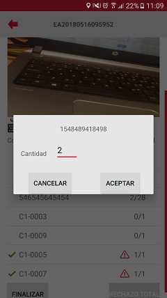 Al presionar el botón [Aceptar] la columna "Cantidad" se actualizará aumentando el contador en cada número de parte escrito y se mostrará nuevamente el lector.