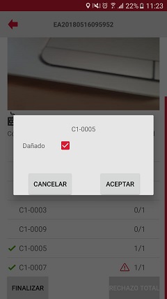 Si el usuario presiona sobre el renglón de un número parte retornable, se mostrará una ventada donde podrá cambiar el estatus de "Dañado" seleccionando o quitando la selección del check.