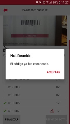 Al escanear más de una vez un contenedor retornable, mostrará un mensaje notificándole al usuario que ese código ya fue escaneado o agregado manualmente.
