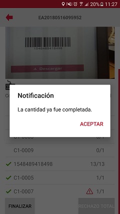 En caso de que la cantidad de los contenedores retornables escaneados o agregados manualmente empate con la cantidad total, mostrará un mensaje notificándole al usuario.