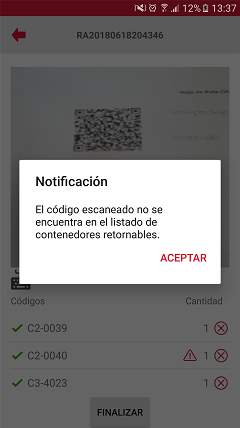 NOTA: En caso de que el usuario escanee códigos que no se encuentren en el listado de Contenedores Retornables (Contenedores No Retornables) se mostrará el mensaje "El código escaneado no se encuentra en el listado de contenedores retornables".