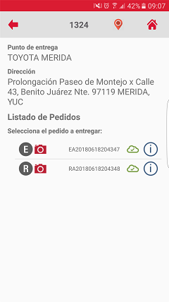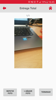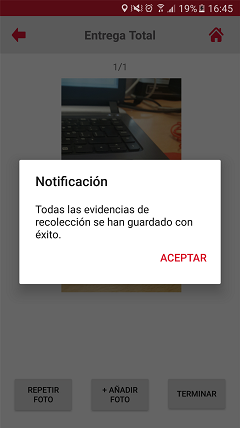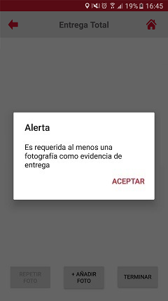 NOTA: Después de la captura de fotografía para prueba de entrega, el usuario podrá repetir tomar la foto o añadir una nueva foto si así se desea.