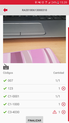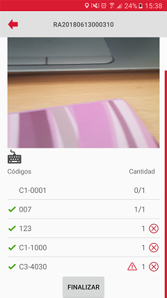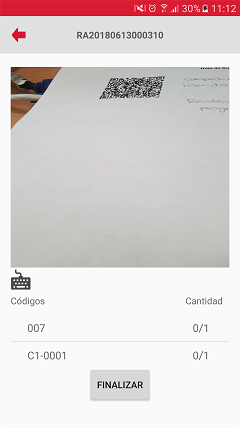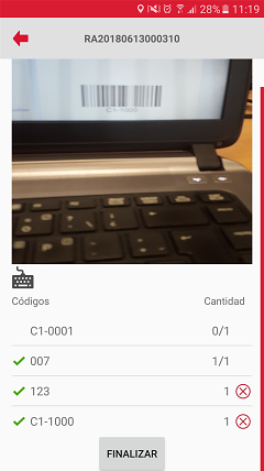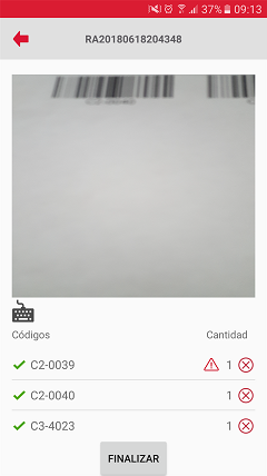 El usuario podrá escanear los códigos pertenecientes al pedido de tipo "Recolección", lo que provocará que la columna "Cantidad" se actualice y aumente el contador en cada número escaneado.