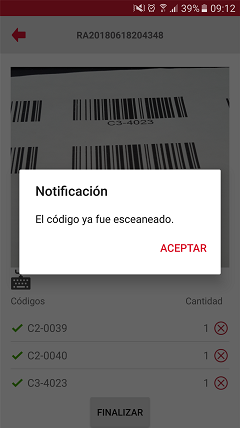 NOTA: Únicamente podrá escanearse una vez cada uno de los códigos. Si el usuario escanea dos veces el código, se mostrará el mensaje "El código ya fue escaneado".