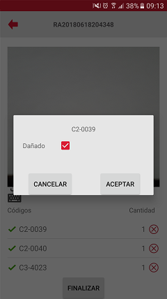 Al indicar con estatus "Dañado" un número de parte, se mostrará un triángulo de color rojo en el renglón del código escaneado.