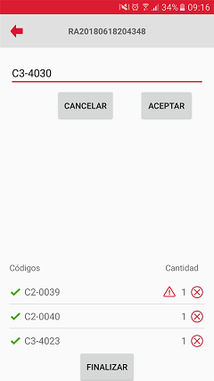 El usuario podrá agregar códigos que no vengan informados en el documento, que se agregarán automáticamente al listado, presentándose un icono "X" indicando que estos códigos no incluidos se podrán eliminar.