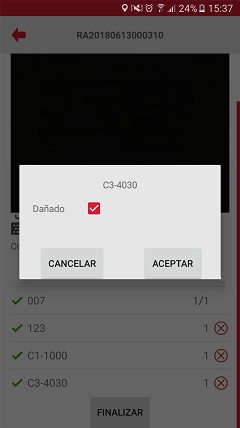 El usuario podrá presionar sobre el renglón del número de parte retornable para cambiar su estatus a "Dañado" si se requiere, presionando sobre el check, mostrándose como seleccionado.