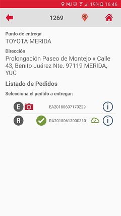 Al guardarse correctamente las evidencias de entrega total, se mostrará la pantalla de pedido, mostrándose un check mark verde que identifica la entrega total del pedido.