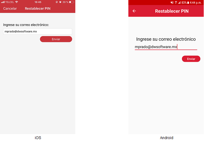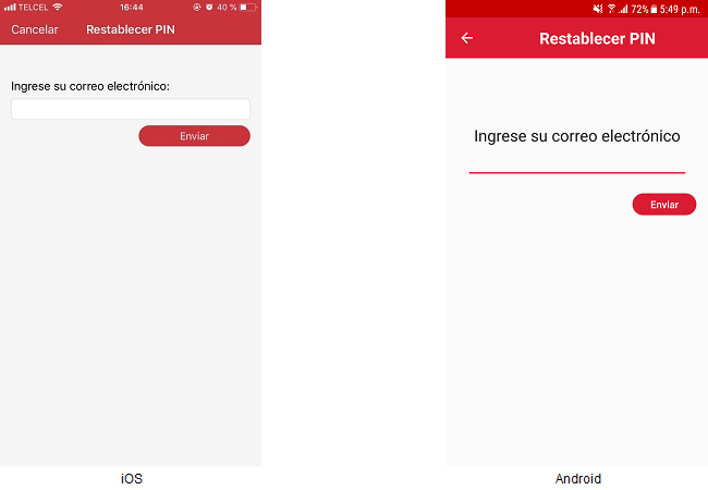 Se mostrará una pantalla en la cual, el usuario debe escribir su correo electrónico para que reciba un código de recuperación de PIN.