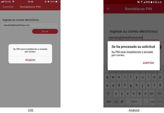 La aplicación muestra un mensaje “Su PIN será restablecido y enviado por correo.” y el usuario acepta el mensaje.