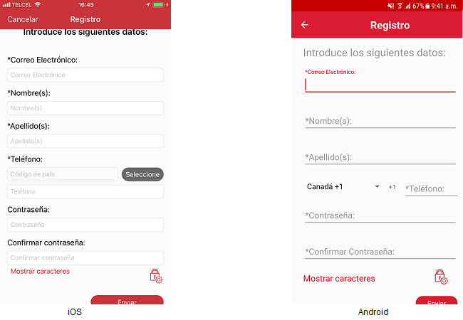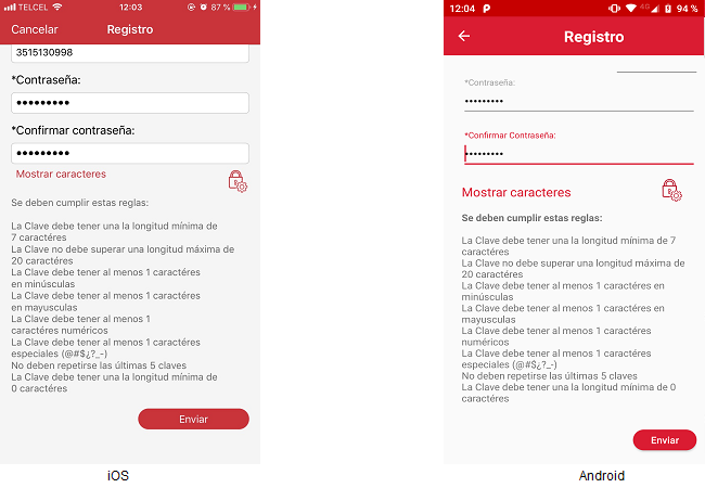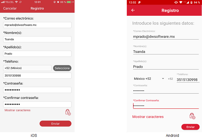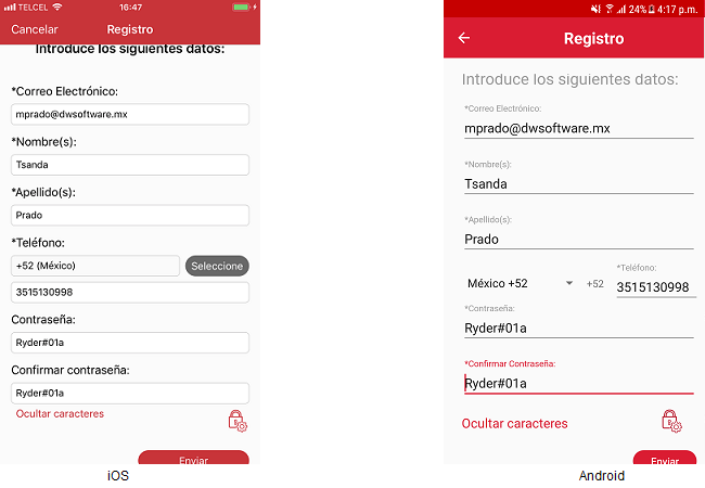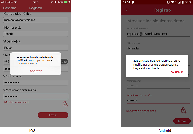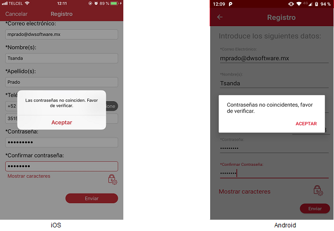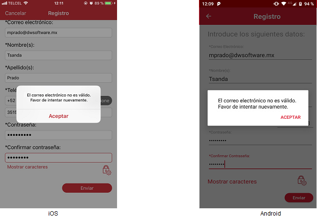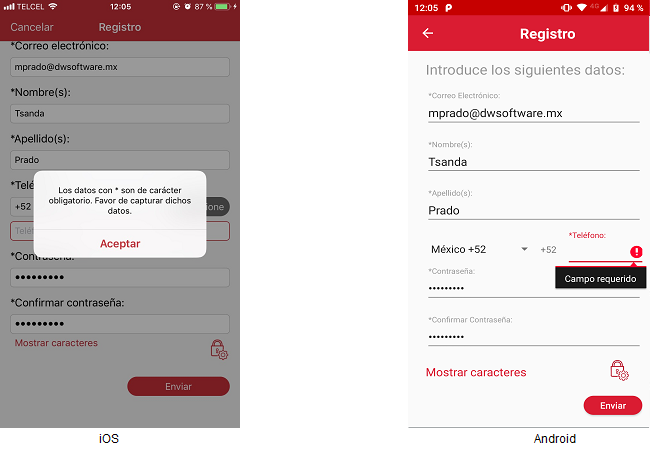 Al no cumplirse la validación de campos obligatorios, se resaltará él o los campos en blanco asignándoles un icono del signo de admiración en color rojo, y en iOS se mostrará el mensaje "Los campos con asterisco (*) son de carácter obligatorio. Favor de capturarlos" que una vez aceptado mostrará los campos faltantes de datos en color rojo.