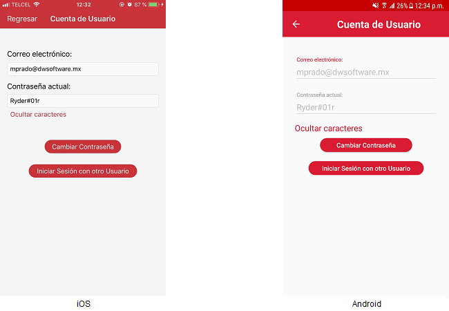 El usuario puede ver los caracteres de la contraseña presionando sobre la opción “Mostrar caracteres” (iOS) o en marcar la casilla “Mostrar caracteres” (Android).