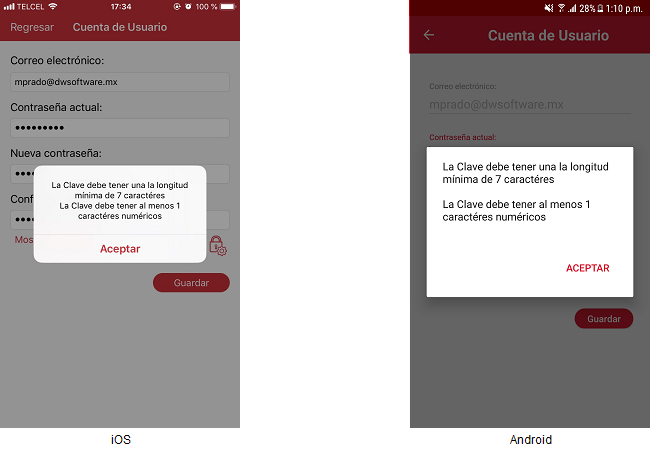 El usuario presiona sobre el botón [Guardar] y la aplicación valida que la contraseña sea válida para el correo electrónico y al no coincidir, se mostrará el mensaje “Contraseña no válida, falta por especificar [regla que no se cumple], favor de verificar.” y el usuario podrá aceptar el mensaje.