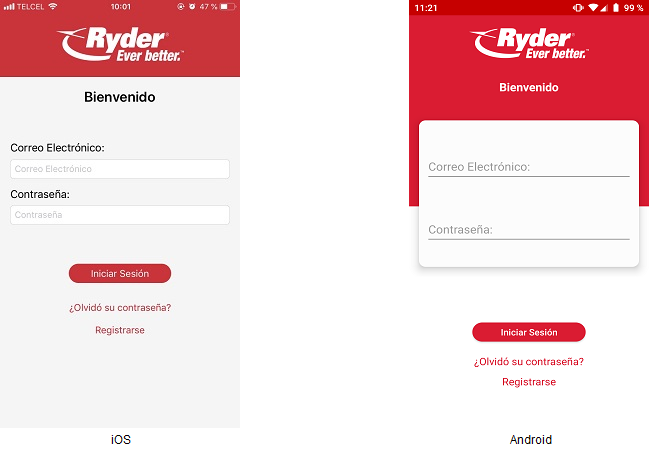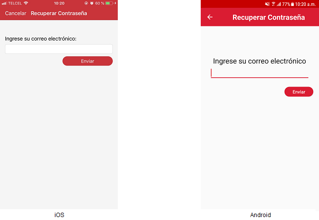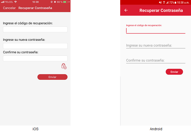 Al terminar de ingresar la información, el usuario debe presionar sobre el botón [Enviar] y la aplicación mostrará la pantalla “Inicio de sesión” y el usuario podrá autenticarse con su correo electrónico y la nueva contraseña.