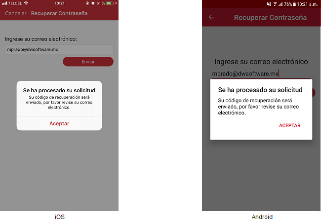 Al terminar, el usuario presiona sobre el botón enviar y la aplicación muestra un mensaje “Su código de recuperación será enviado, por favor revise su correo electrónico.” y el usuario puede aceptar el mensaje.