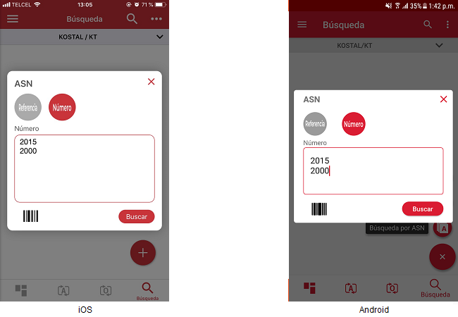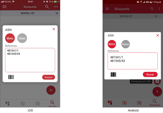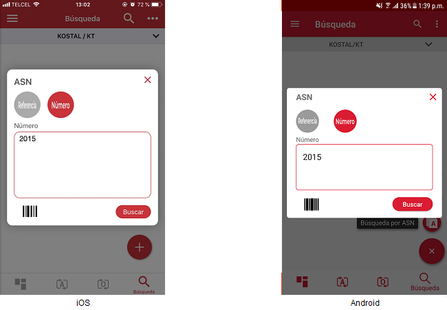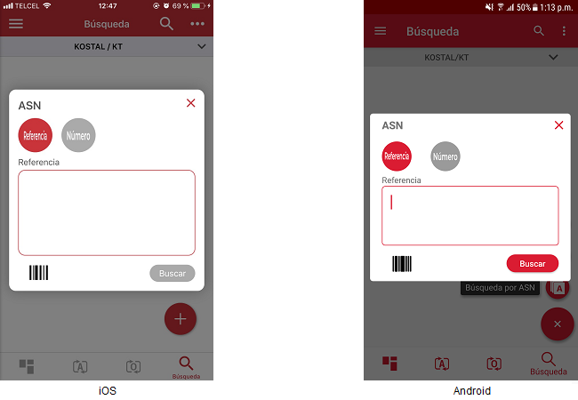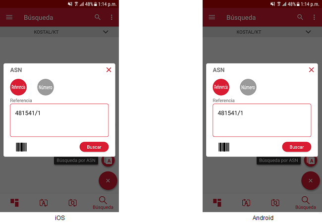 El usuario puede realizar una búsqueda presionando sobre la opción para buscar por ASN y la aplicación muestra un modal para buscar ASN por “Referencia” o por “Número”. Por default estará seleccionado la opción “Referencia”.