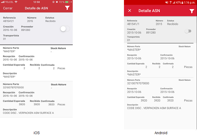 El usuario presiona sobre un ASN y la aplicación muestra la lista de números de parte/líneas del ASN seleccionado.
