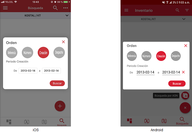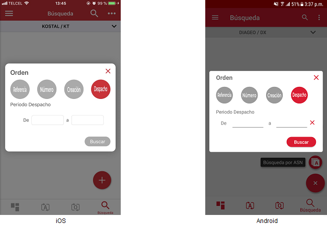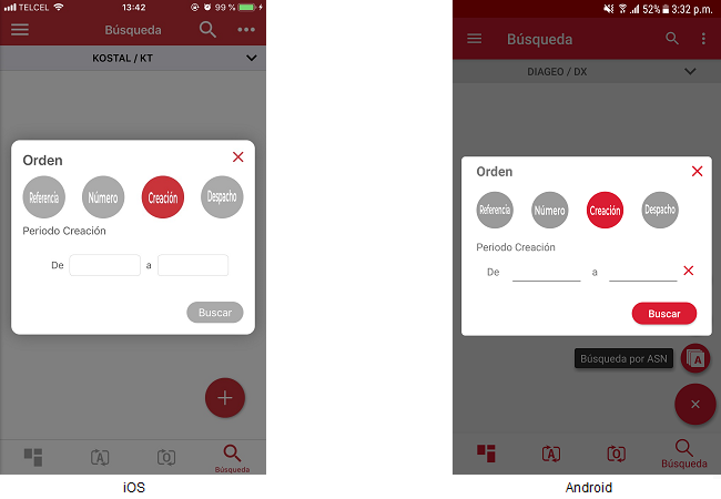 El usuario podrá seleccionar la opción para buscar por fechas de “Creación” o “Despacho” y la aplicación mostrará campos para ingresar un rango de fechas en ambas opciones.