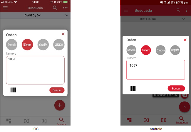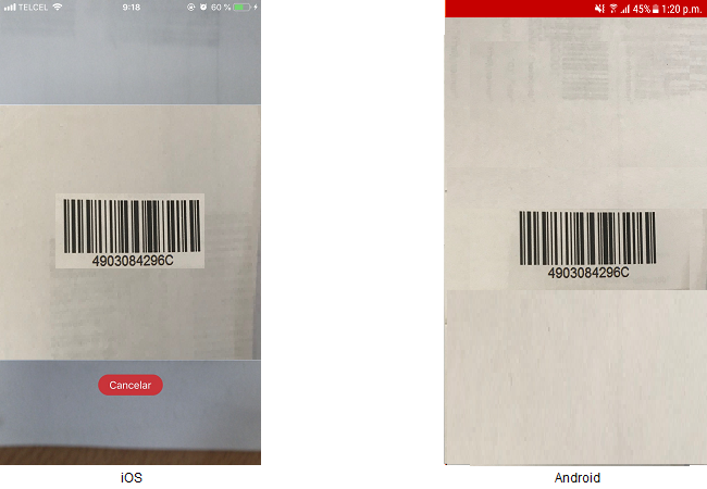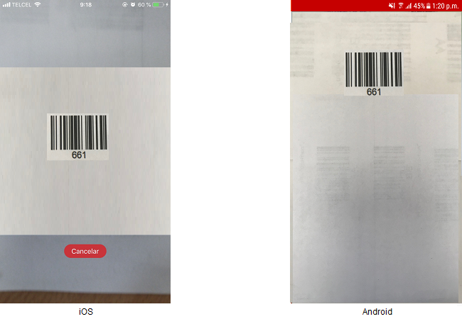 El usuario tiene opción de realizar lecturas de códigos de barras de órdenes, al presionar sobre el icono de “código de barras”, abriéndose la cámara del dispositivo.