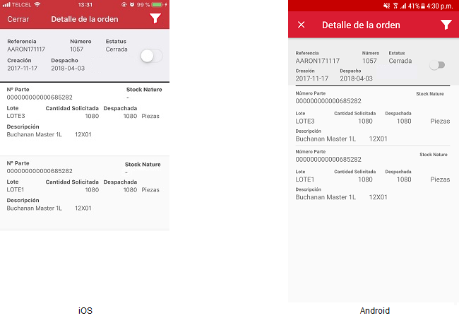 El usuario está ubicado en los resultados de la búsqueda de "Orden" y la aplicación muestra el detalle que contiene:
