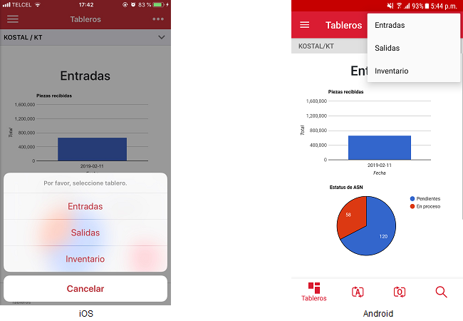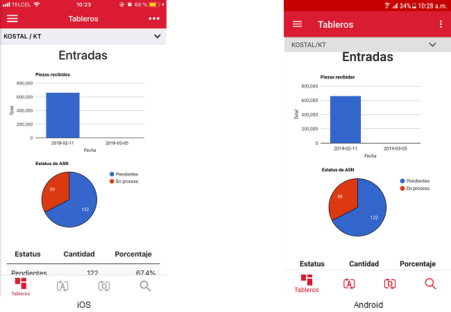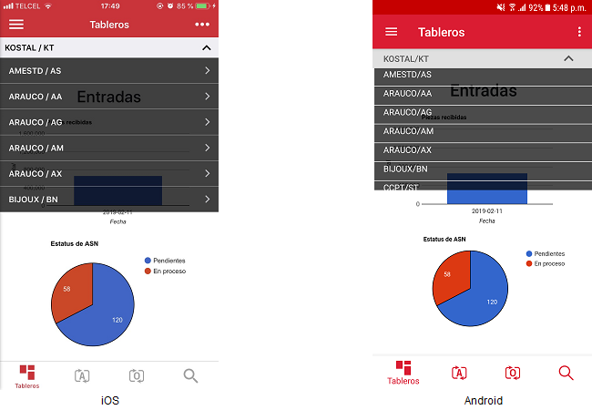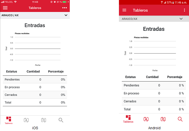 El usuario presiona sobre el tab “Tableros” ubicado en la esquina inferior izquierda de la pantalla y la aplicación muestra el último tablero consultado por el usuario autenticado o el default que es el tablero de Entradas.