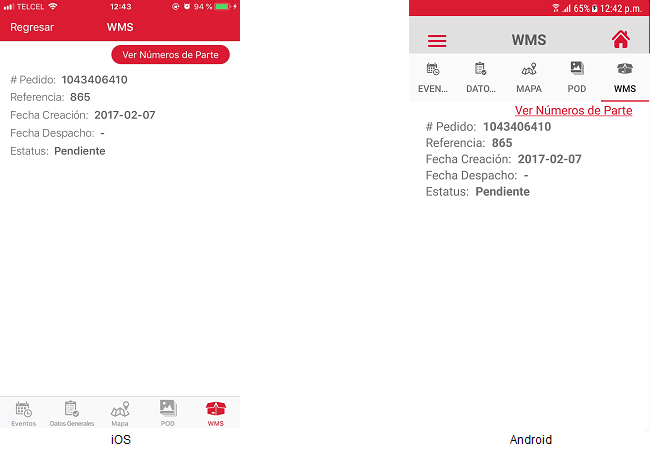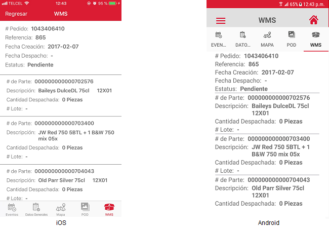 El usuario presiona en la opción “WMS” y se muestra la información del pedido solamente si existe en el WMS consultado: