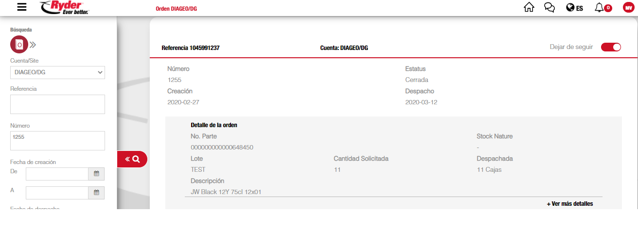Si se selecciona la opción "Ver más detalle" se muestra la lista de número de serie asociados al número de parte seleccionado. De cada número de serie se muestra: