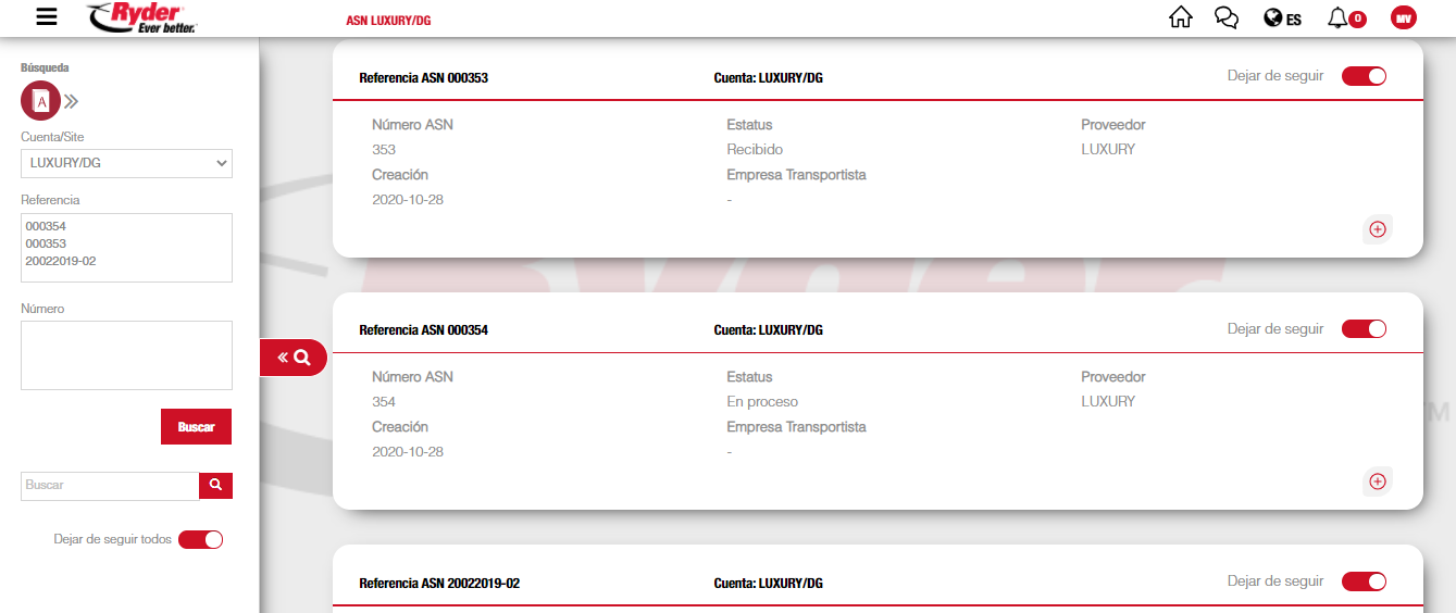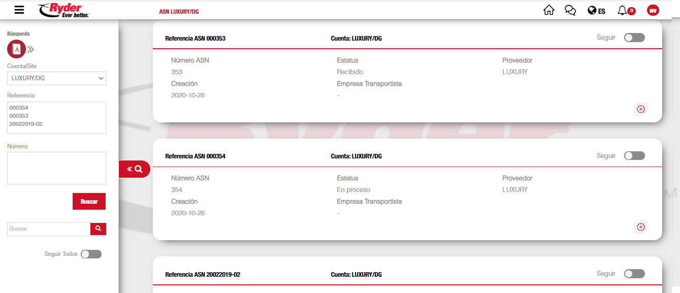 Los ASN podrán ser consultados en la pantalla “ASN Seguidos”.