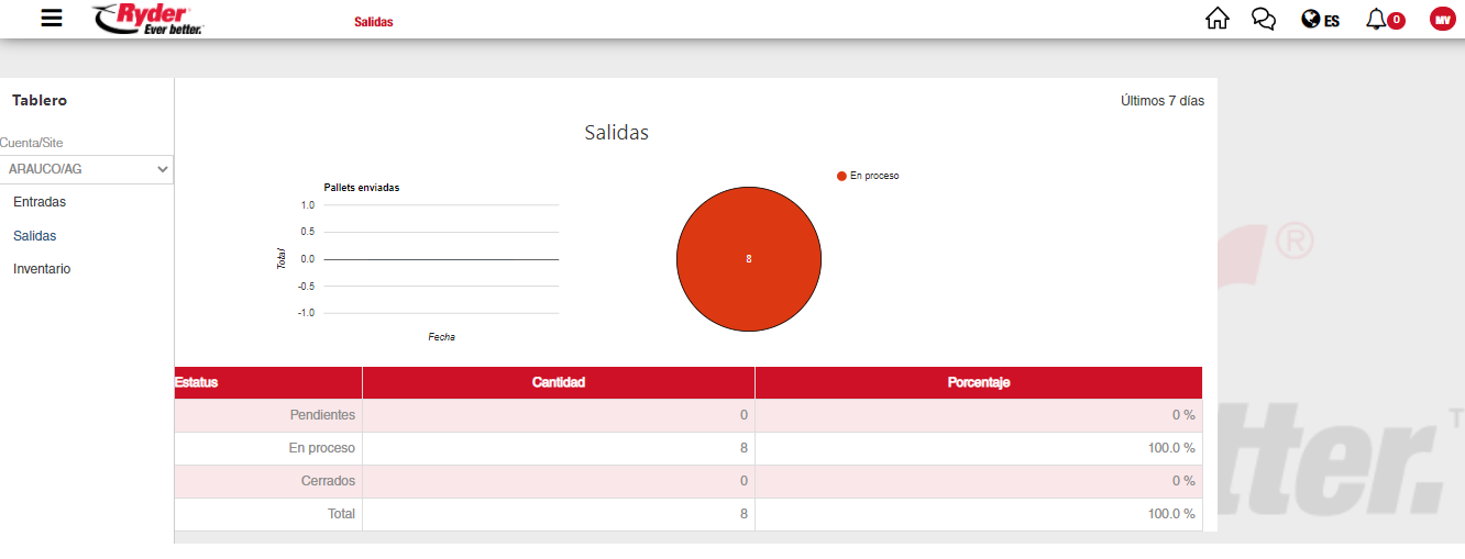 El usuario presiona sobre la opción de “Tableros” ubicado en la esquina superior izquierda de la pantalla, posteriormente selecciona la Cuenta/Site de u elección y selecciona la opción de "Salidas".
