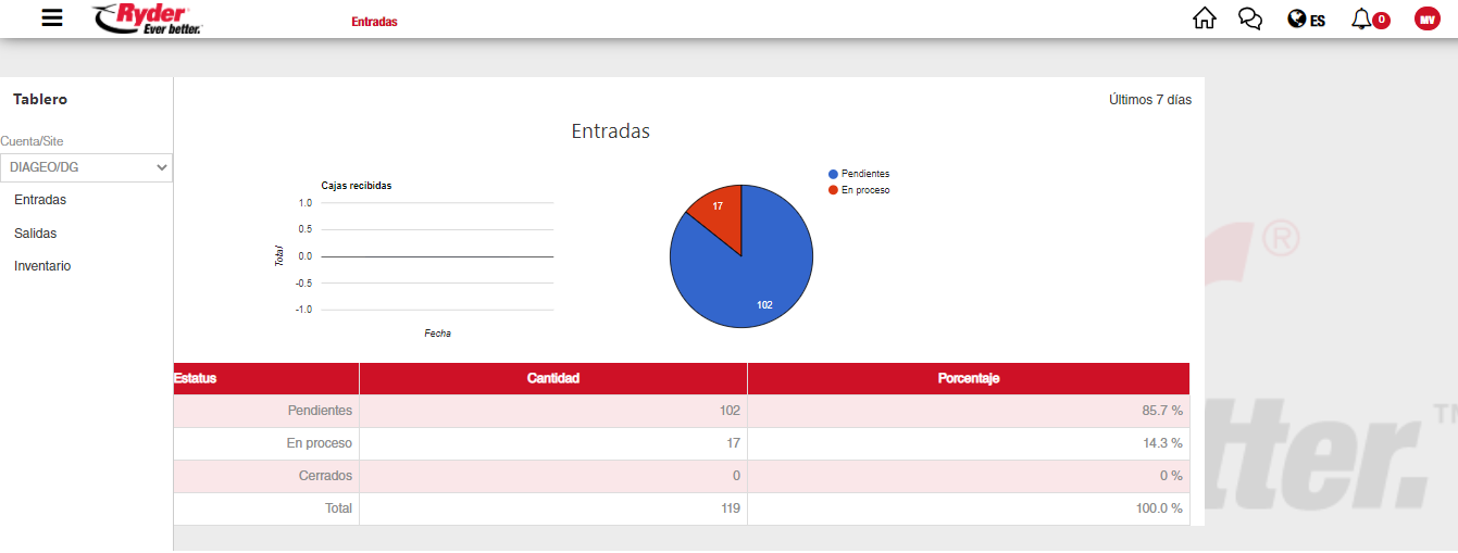 El usuario presiona sobre la opción de “Tableros” ubicado en la esquina superior izquierda de la pantalla, posteriormente selecciona la Cuenta/Site de u elección y selecciona la opción de "Entradas".