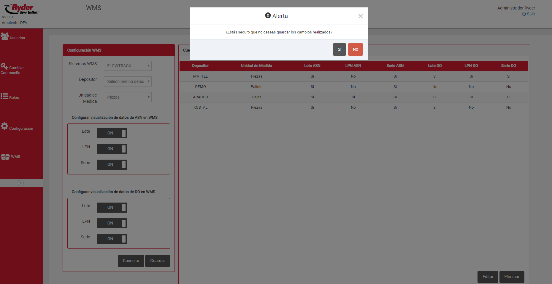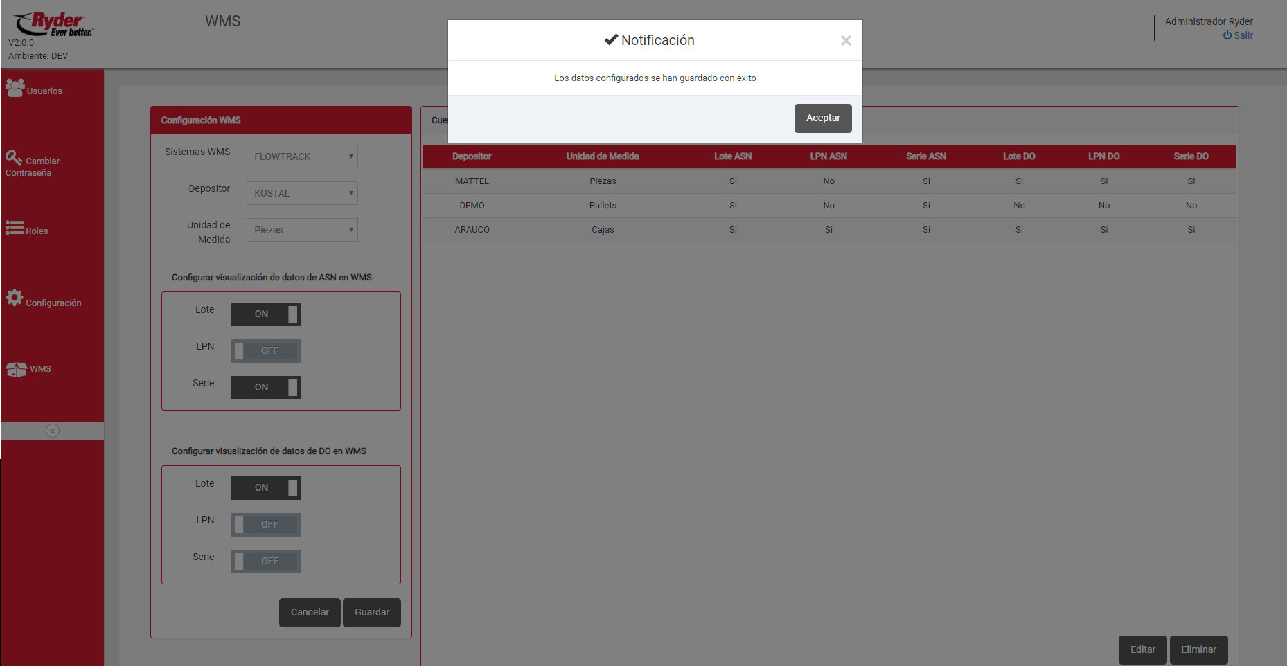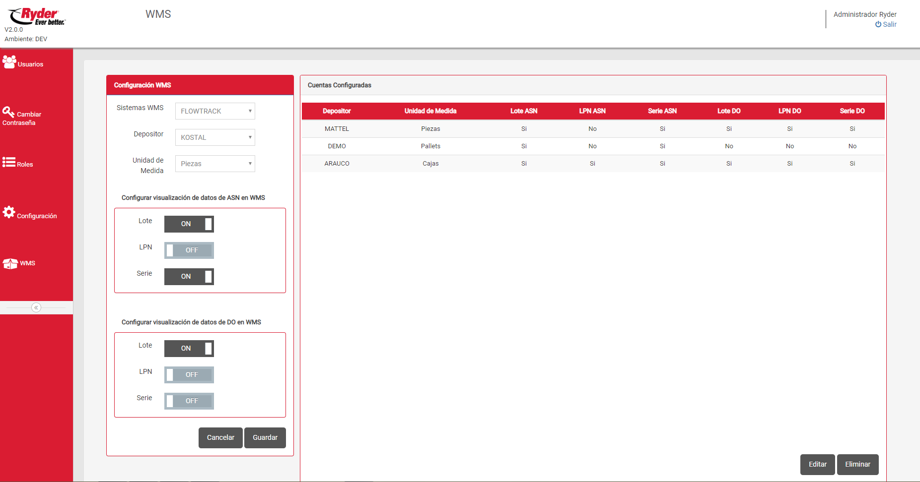 The user must select a "WMS System" and "Account" to change, since settings are made by "Account" and the "Config....." section, whether it's ASN or Orders, all switch buttons are set "ON" and all the WMS, Mobile Track & Trace, and Web Track & Trace application information will be shown.