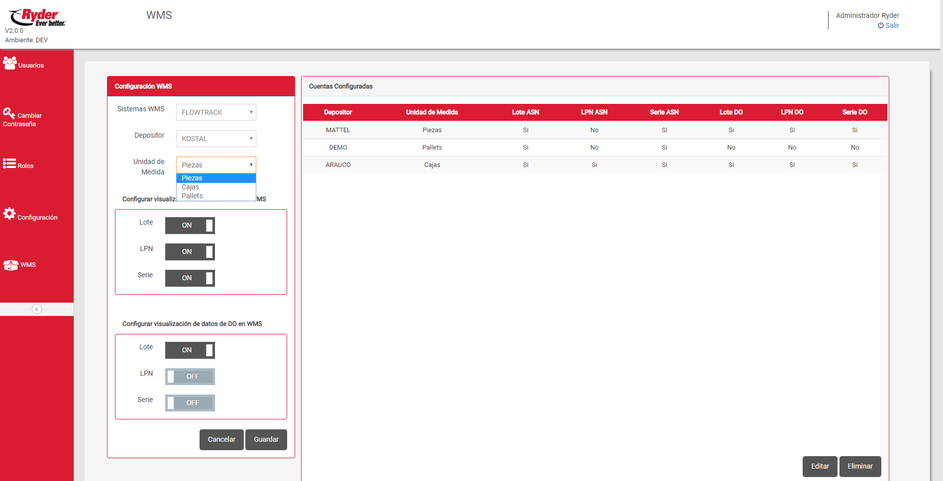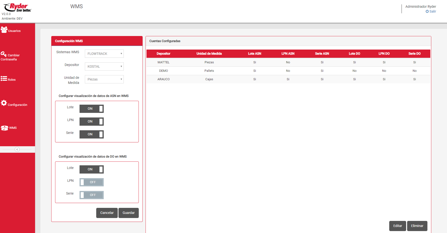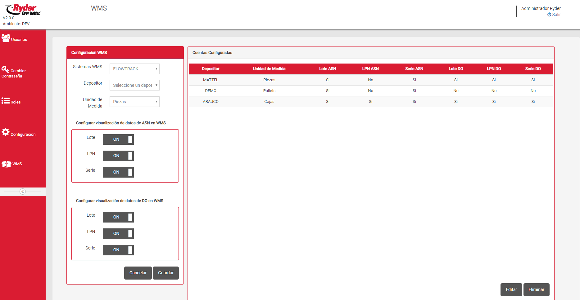 The user must select the WMS option in the side menu, that will be shown by system as "WMS."