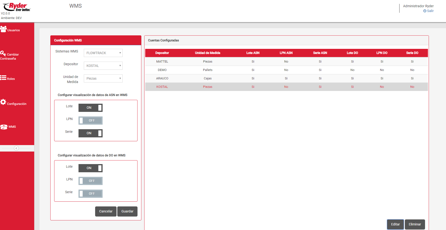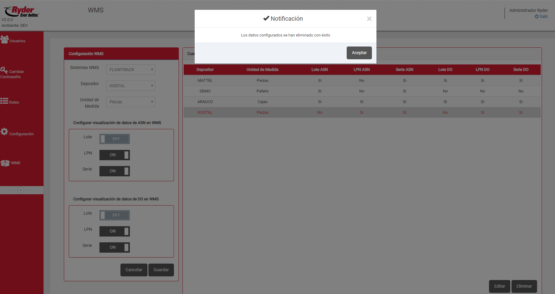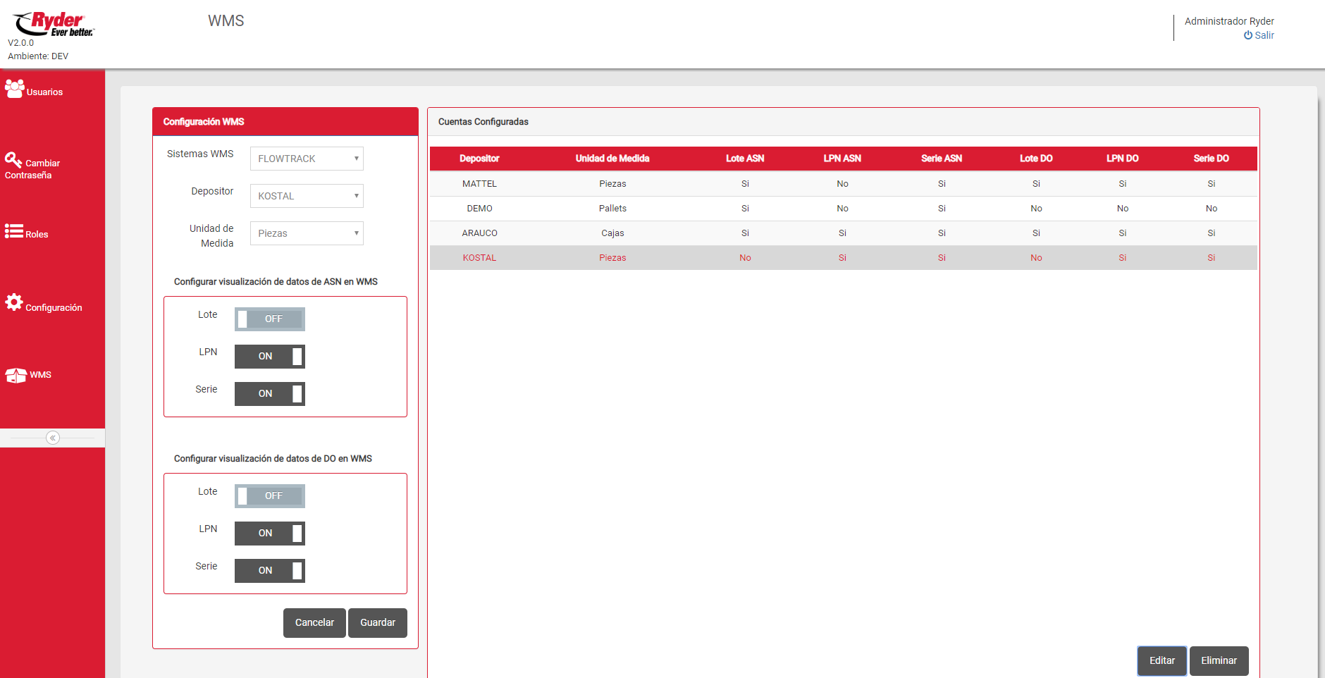 The user must select the WMS option in the side menu, that will be shown by system as "WMS."